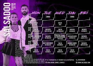 Στις σχολές διδάσκονται salsa 0n 2 (NY style), Men’s style, Lady’s style, Afrorumba, Bachata, Kizomba, Cha cha boogaloo, Pachanga, Hip hop, Pilates, Zumba. Μπορείτε από την ιστοσελίδα μας να ενημερωθείτε για το πρόγραμμα των σχολών και για οποιαδήποτε απορία ή επιθυμία έχετε, μπορείτε να επικοινωνήσετε μαζί μας στα τηλέφωνα της σχολής. Ιδιαίτερα μαθήματα πραγματοποιούνται κατόπιν συνεννόησης με τους δασκάλους.